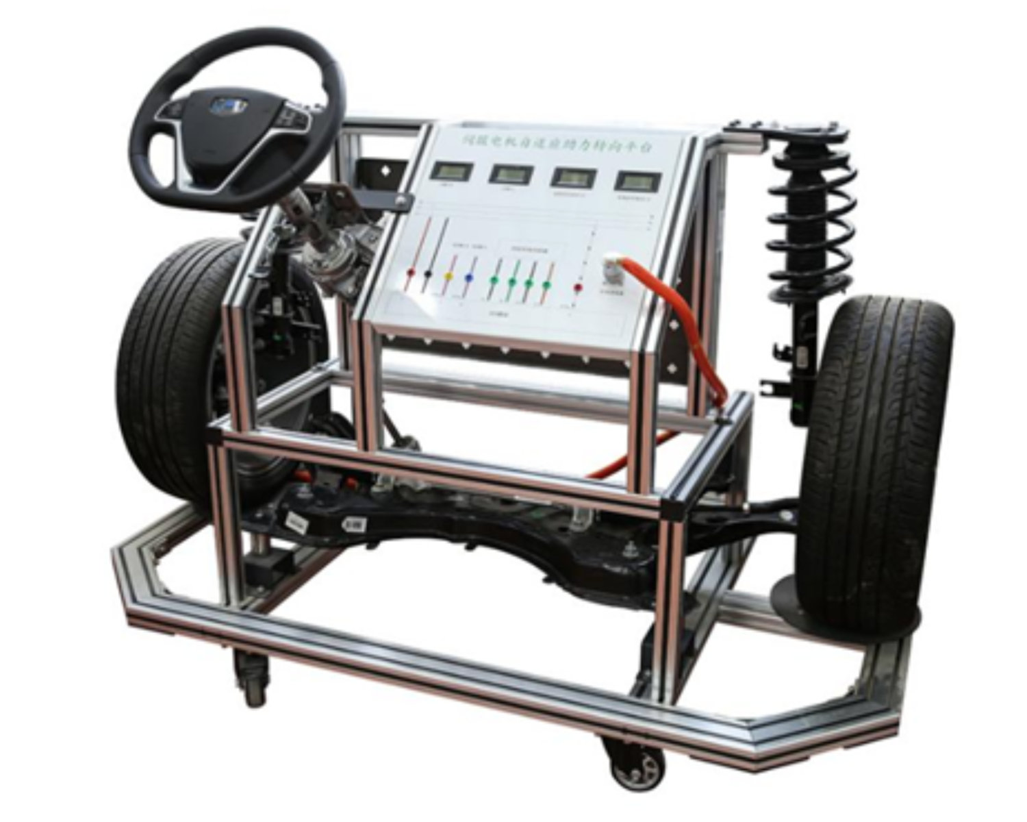 The training platform is composed of the original hydraulic power steering assembly, front axle assembly, steering column assembly, shock absorber, steering wheel, tire, and a movable test bench.