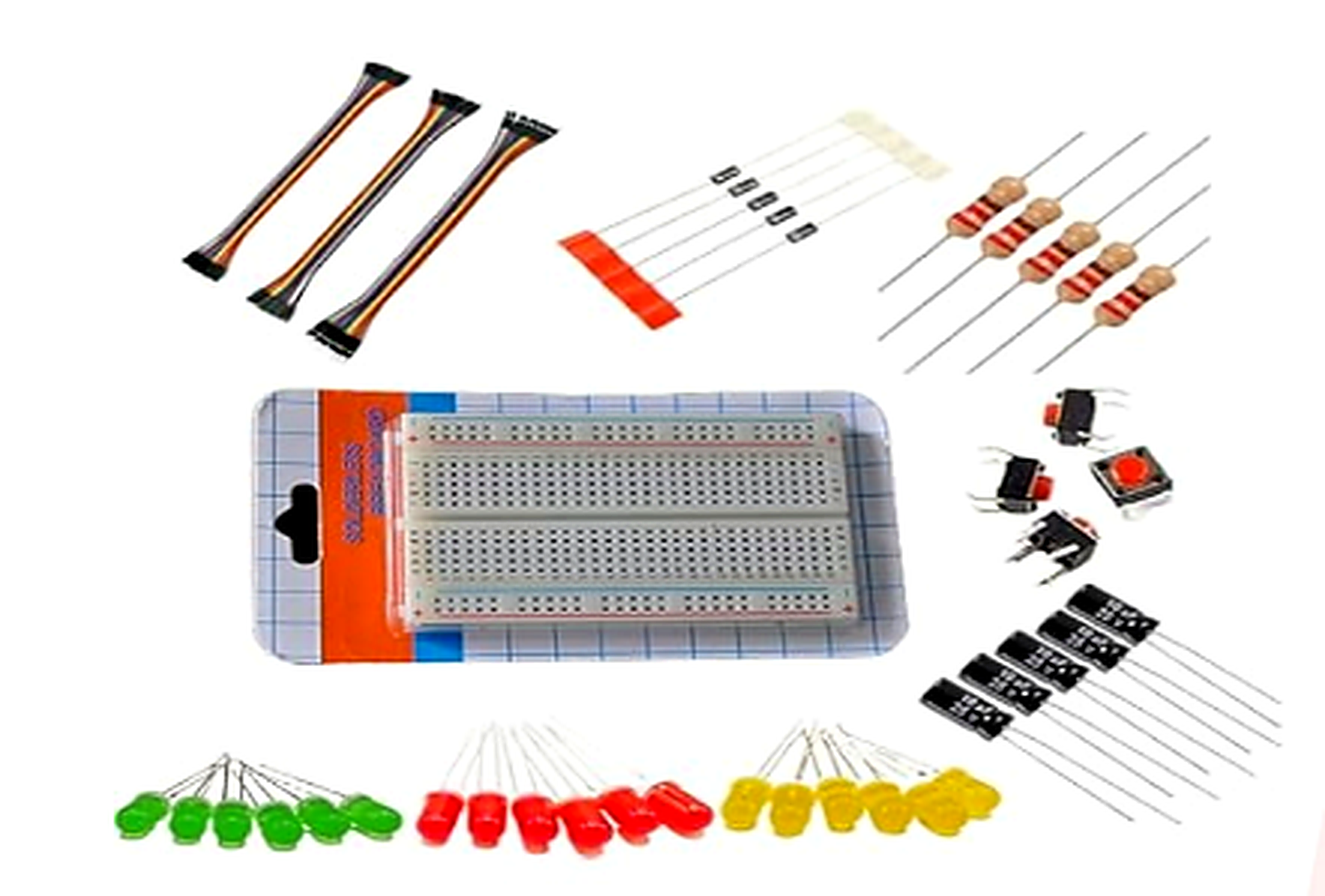 Intended Use: Educational electronic prototyping and circuit learningKit Configuration: Basic configurationPrototype Boards: Solderless breadboards providedConnecting Wires: Flexible jumper wires of various lengthsWire Terminations: Female, male, and female-male connectorsReusability: Designed for repeated connection and disconnection without loss ofcontactComponent Compatibility: Compatible with common electronic components such as resistors, LEDs,transistors, ICs, microcontrollers, and similar devicesWire Insulation: Insulated wires for safe operationBoard Material: Heat-resistant plastic base